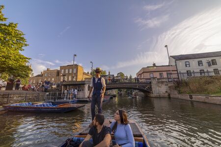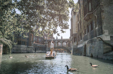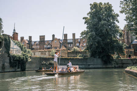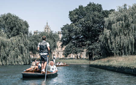 CAMBRIDGE, UK - AUGUST 11, 2015: Punting on the river Cam. Some companies and students hire punts to visitors and tourists. Cambridge is a university city and one of the top five universities in the world.