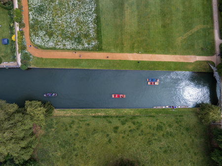 Aerial view of the old town of Cambridge with narrow canals and river boats
