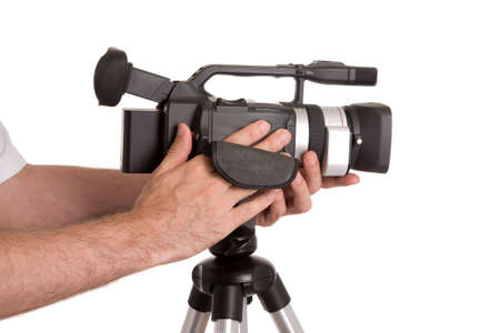 lens of camcorder. cropped man with camcorder. videographer making video.