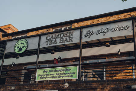 London, UK - August 12, 2020: Sign on the Camden Tea Bar in Camden Market. Started with 16 stalls in 1974, Camden Market is one of the busiest retail destinations in London.