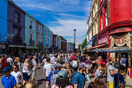London/UK - July 21 2018: People walking on Portobello Market, one of London's notable street markets, known for its second-hand clothes and antiques