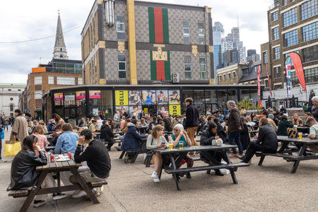 LONDON, ENGLAND - April 12, 2023: a motley crowd of East London drinking a beer outside of pub.
