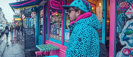 LONDON - SEPTEMBER 30, 2019: Colourful artwork on the front of shops and coffee bars on Camden High Street