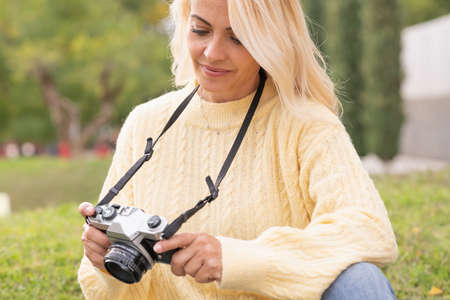 Close up view of a blonde woman sitting on a park while using a camera hold by a leash
