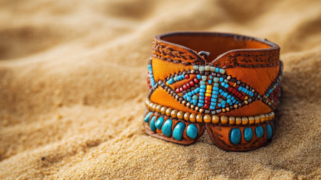 A stunning handmade leather bracelet featuring vibrant beadwork and stones, beautifully displayed on soft sand, highlighting its artistic and cultural essence.