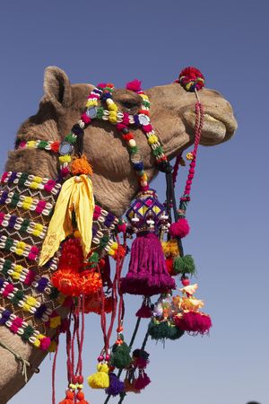 Head and neck of a camel decorated with colorful tassels, necklaces and beads. Desert Festival, Jaisalmer, India