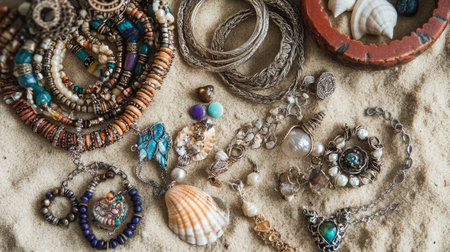 A flat lay of boho-style jewelry including beaded bracelets, shell necklaces, and silver rings, scattered on a textured sandy surface.