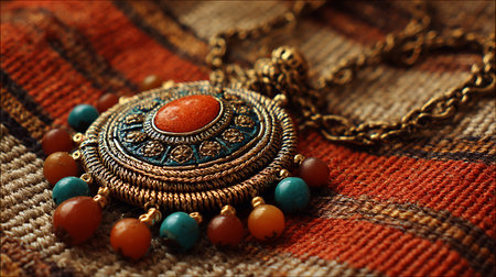 Close-up image of stunning handcrafted jewelry featuring silver pendants and colorful gemstones against vibrant textured textiles, showcasing artistry and elegance.