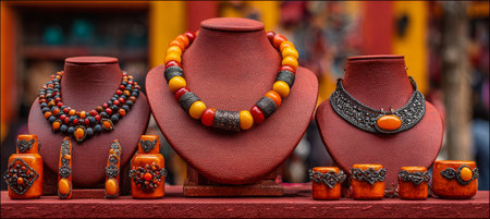 Colorful handmade jewelry and textiles showcase diverse cultural traditions and elegance generated by artificial intelligence