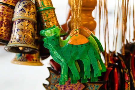 Colorful painted wooden Christmas decorations on a market. Chiang Mai, Thailand.
