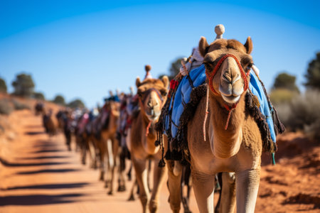 A tourist caravan drives the camel through the desert at the Sand Dunes of Port Stephen in New South Wales, Australia