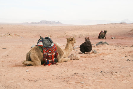 Jordan. 10 Dec 2009. A Bedouin camel herder rests near his herd of camels in the Wadi Rum desert in Jordan