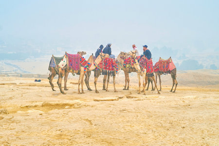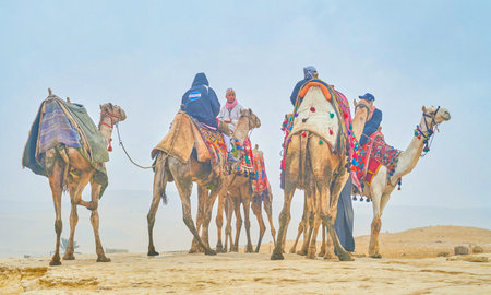 GIZA, EGYPT - DECEMBER 20, 2017: Winter is a low tourist season and cameleers have a lot of time for speaking, on December 20 in Giza