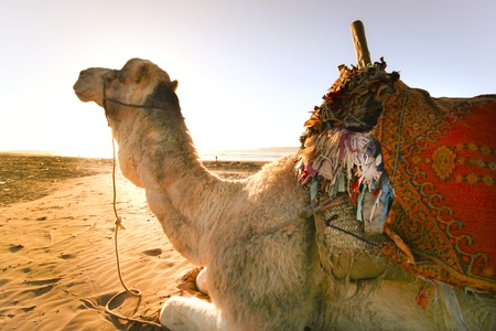 Camel resting on the sandy beach of Atlantic.