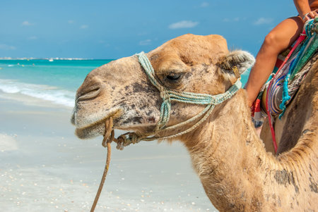 Photo of a head of a dromedary on the beach of Tunisia with the Mediterranean Sea in the background