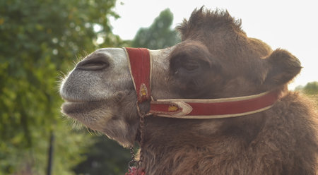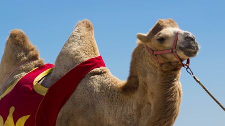 Close up portrait of cute camel in harness, saddle and colorful carpets with tassels