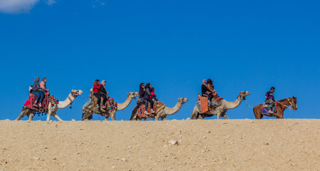 CAIRO, EGYPT - JANUARY 28, 2019: Tourists riding camels near Giza pyramids, Egypt