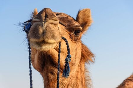 Arabian camel at close-up over blue sky