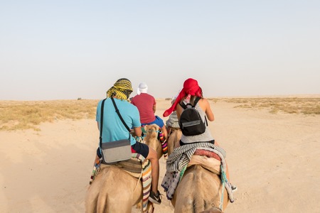 Douz, Tunisia - July 22, 2018: Tourists on camels in the Sahara Desert, Tunisia, Africa