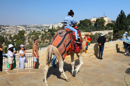 JERUSALEM, ISRAEL - OCTOBER 29, 2022: Tourist enjoys a camel ride on Mount of Olives in Jerusalem, Israel. Jerusalem is a major tourism, pilgrimage and business destination in Israel.