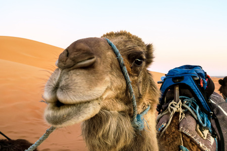 yawing camel with wide opened mouth seems like eating a sunset sun above another one camel in camel tour group at the Erg Chebbi Desert in Morocco