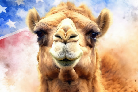 Portrait of a camel against the background of the American flag.