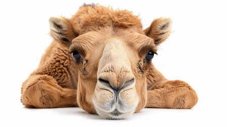 This isolated camel rests calmly, captured in detail, highlighting its texture and elegance on a white canvas.