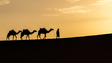 Silhouette of unidentified Berber man with his camel caravan on sand dunes during sunset in Sahara Desert, Morocco