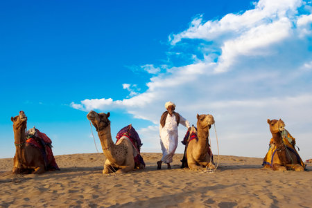 Jaisalmer, India - February 15, 2019: Indian cameleer with camels in Thar desert