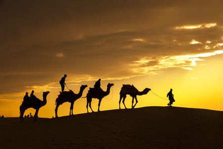 Camel caravan silhouette through the sand dunes lead nose at Thar Desert India dramatic sunlight background