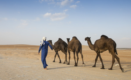 Arab Bedouin man with his camel in the Desert in Abu Dhabi western region Liwa Desert in United Arab Emirates in April 30, 2010