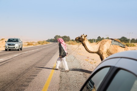 Agadir, Jordan - December 22, 2017: Arab man with a camel is walking across the road