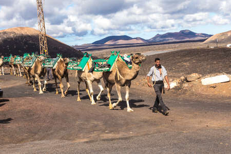 Yaiza, Spain - November 14, 2014: camel guide with a caravan of camels walks direction camel farm at timanfaya national park in Lanzarote.