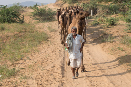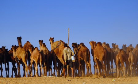 PUSHKAR, INDIA - NOVEMBER 7: A camel trader guides his herd towards the Pushkar cattle fair on November 7, 2011 in Pushkar, Rajasthan, India. This fair is the largest camel trading fair in the world.