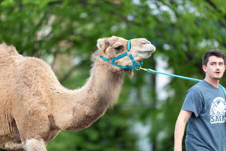 Louisville, Kentucky, USA - May 2, 2019: The Pegasus Parade, man walking a camel on leash during the parade, down the street