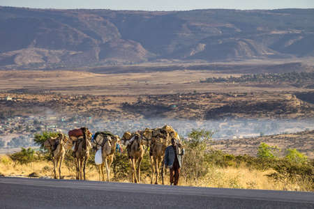 Lalibela, Ethiopia - Feb 12, 2020: Ethiopian people seen on the road from Lalibela to Gheralta, Tigray in Northern Ethiopia, Africa. Men with camels