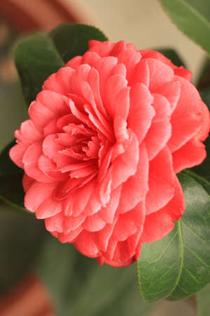 Close up Red camellia flower with green leaves background. Spring time. Blooming garden in winter. Selctive focus.