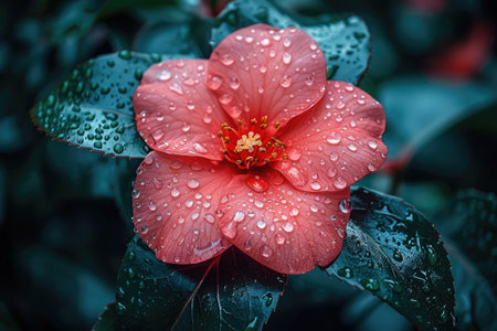 Dew Kissed Camellia Flower with Vibrant Green Leaves
