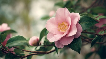 Delicate Pink Camellia Blossom with Vibrant Yellow Stamens Blooming on Branch