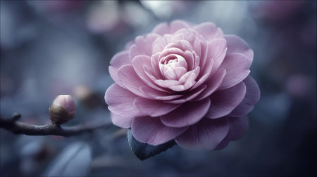 Elegant Pink Camellia Flower with Bud on a Dark Background