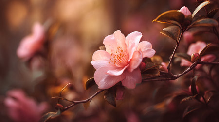 Pink camellias in bloom, soft lighting. Nature and beauty concept