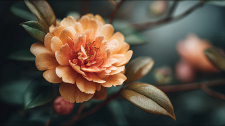 Dreamy Soft Peach Camellia Flower Blooming in the Garden Sunlight