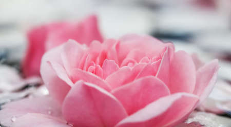 Pink rose flowers and white petals with drops and blur light background. For water festival or spa
