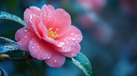 Delicate Pink Camellia Blossom Adorned with Morning Dew Drops