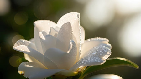A close-up captures a pristine white flower, showcasing its soft petals and delicate water droplets. The image features a shallow depth of field, highlighting the flower against a blurry, sunlit background. This composition suggests a natural environment and is suitable for various commercial uses, including artistic and decorative purposes.