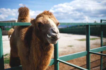 A shallow focus of a portrait of a Dromedary Animal, also known as Arabian camel opening his mouth