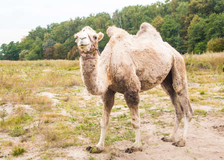 two-humped camels walks in the green Park in summer. Summer camels walks in the Park. selective focus.