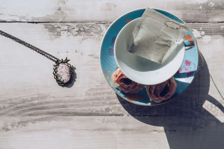 tea time concept with tea bag inide porcelain teacup and vintage pendant