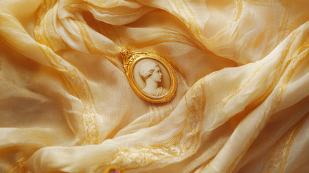 A beautiful vintage cameo pendant featuring a delicate profile set against a backdrop of luxurious golden silk fabric, showcasing elegant folds and textures.