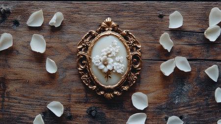 A vintage floral brooch rests elegantly on a rustic wooden surface, surrounded by delicate white petals, creating a nostalgic and romantic ambiance.